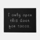 Esteira de porta engraçada para amantes do taco! "Eu abro somente esta porta para o texto escrito à mão branco do estilo do tacos".