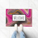 Uma porta de boas-vindas com um design abstrato de aparência ranhosa. As cores rosa e preta misturam-se e unem-se num movimento giratório. Espelhos de dourada falsa entre as camadas.