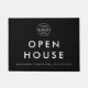 Modelo moderno de Porta Imobiliária de Casa Aberta, num estilo moderno mininalista, num fundo na moda preto. Carregue facilmente o logotipo da sua empresa para a sua empresa imobiliária e adicione seus detalhes de contato (telefone, email, mídia social e muito mais). O acessório perfeito para qualquer corretor ou agência de listagem de propriedades!