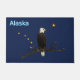 Uma águia careca varreu o céu de sua perca em um galho de árvore; sobreposto a uma bandeira do Alasca. Leitura de texto, "Alaska" aparece em azul e branco brilhantes.