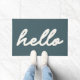 Esta porta na moda apresenta um design moderno minimalista da palavra Hello em letras de script em um fundo verde-verde-pó empoeirado.