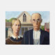 Este é o clássico quadro Grant Wood, American Gothic, mostrando um fazendeiro e sua esposa parados em frente à sua fazenda, ele com seu garfo de jarra, sua olhando de lado para ele.