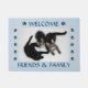 As palavras neste doormat dizem, "os amigos & a família bem-vindos." Mostra um gatinho preto com os olhos verdes redondos, um gatinho listrado cinzas com olhos azuis, e um gatinho listrado cinzas com olhos verdes assim como as patas brancas pequenas e uma caixa branca. Encontrando-se de lado a lado, estes três gatinhos fazem um doormat adorável para cada amante do gato.