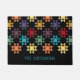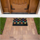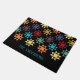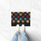 Bem-vindos convidados à sua casa em estilo com esta porta personalizada. Este tapete de boas-vindas ou porta é padronizado para se parecer com uma colcha Amish com um impressão de bloqueio de Ohio Star em vermelho, roxo, azul, amarelo, dourado, laranja e verde contra um fundo preto. Está pronto para ser personalizado com um nome ou outro texto em letras azuis brilhantes.