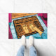 O pé de uma pessoa está sendo escaneado em uma porta de código de barras com as palavras Barcode Scanner Feet impressas nela. Seja bem-vindo aos seus entes queridos com este estilo - Amuse Barcode Design - Scan Your Feet Before Enter Doormat.