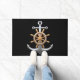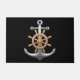 Doormat with image of a ship's wheel and anchor in colors of silver and gold, against a black background.