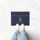 Elegante tapete de boas-vindas personalizado com o nome do seu barco ou capitão em um texto dourado chic em um fundo azul-marinho. Criado por Thisisnotme©