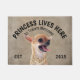 Irritado Chihuahua Personalizado Amante de Cachorro bem-vindo. Este tapete de boas-vindas pode ser personalizado com o nome do seu cão, o slogan também pode ser mudado ou você pode usar uma fotografia do seu próprio cão (certifique-se de que é transparente). O texto diz: Princesa vive aqui... Todos os tratamentos são bem-vindos Edite o design para alterar a fonte, as cores e a cor de fundo. Ao substituir a imagem do seu cão, use uma imagem transparente. Faz um presente maravilhoso para uma festa de inauguração, feriados, amantes de cachorros e a maioria das vezes.