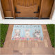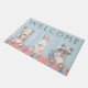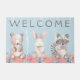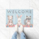 Este design bonitinho apresenta um fundo de floresta azul com um guaxinim, coelho, e animais de bosque de urso sentados em uma cama de flores rosa. O texto personalizável diz WELCOME em letras escuras de cinza.