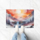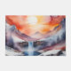 Aquarela de neve coberta por montanhas sob sol vermelho com pequeno fluxo de água e cascata