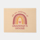 Um belo porteiro ideal para a vovó. Um arco-íris caprichoso em pinks e laranja. No meio do arco-íris está um coração de amor rosa. Sobre o arco-íris, em texto cor-de-rosa, lê-se "Todos são bem-vindos" e abaixo está a palavra "Casa da Vovó". Ambos são modelos de texto que você pode usar para alterar qualquer texto, se desejar.