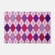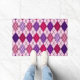 Esta porta tem um design de arte de formas de diamante feitas a partir de ângulos sobrepostos em linhas pretas coloridas em tons roxos e cor-de-rosa com linhas pretas diagonais fazeres a design