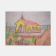 Um desenho a lápis de aquarela e pintura da Capela Alto Vista em Aruba com Mar Caribe e vários cactos, rochas e arbustos espinhosos.