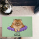 An orange Persian cat on a purple pillow is showing their attitude.
