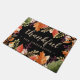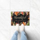 O tapete personalizado de boas-vindas em chic e preto durável apresenta "agradecido" em um roteiro de caligrafia manuscrita, rodeado por folhas coloridas de outono e galhos em matizes ricas do outono. Personalize com seus nomes ou nomes de família na base para uma maneira perfeita de adicionar torcida de outono à sua porta nesta temporada de Ação de Graças.