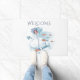 Pintura aquosa de baleia com balões cardíacos e escola de amigos de peixes sobre fundo branco. Texto de boas-vindas personalizável