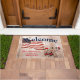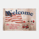 Adicione seu nome, família em uma fonte de script e primeiro em uma fonte de bloco, em vermelho em um fundo bege de aparência intagal dominado por uma bandeira americana voadora e uma bela banda de fibra e tambor preto-e-vermelho desenhada à mão. "Bem-vindo" está gravado em uma fonte azul, em negrito, na parte superior do design.