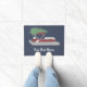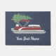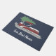 Crie algum decoro de férias personalizado para sua casa ou seu barco. Esta porta personalizada tem uma ilustração de um barco de pontoon vermelho e branco com uma árvore de Natal verde amarrada ao topo, contra um fundo azul. Está pronto para ser personalizado com o nome do seu barco em letras brancas.
