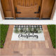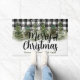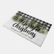 Linda neve no inverno estação de inverno bonitinha de porta. Esta porta de natal é xadrez de búfalo preto e branco no fundo. Parece tão aconchegante com a queda de neve e as madeiras dos pinheiros com aquarela. O texto Feliz Natal é personalizável e o nome da família também.