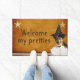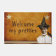 Decoração de Halloween com bruxa preta vintage com chapéu chique em corte de foto sobre fundo desgastado com estrelas e texto "Bem-vindas minhas lindas" personalizável
