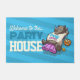 Faça da sua casa a casa da festa com esta porta com um rinoceronte relaxado em um inflável. Use "Personalizar esta modelo" para ajustar "Bem-vindo ao..." texto "PARTITY HOUSE" e "Party Animal", se desejado. Um rinoceronte feliz, aproveitando o sol de verão, se resfriando em um rosa brilhante inflável na piscina. Prontos para festas, completos com pato de borracha favorito e uma bebida refrescante em uma bandeja flutuante.