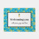 O tapete da porta é mostrado na borda azul-céu e ananases com borda negra interna e texto sobre fundo branco. O texto diz "Bem-vindo com paz, alegria e amor". Tem um ícone de abacaxi solteiro perto do topo. O abacaxi simbolizou a hospitalidade. Personalize este tapete ou comprar como está.