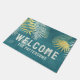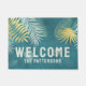 Bem-vindo Ouro Tropical Palm Family Name Doormats Doormats Door Mats apresenta um padrão moderno de folha de palma tropical em um design dourado e teal com o texto "Bem-vindo" e seu nome pessoal na base. Concebido por © Evco Studio www.zazzle.com/store/evcostudio