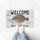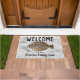 Bem-vindo à Página Inicial "Seu Nome Familiar", ou mude para a casa de campo. Um tapete de boas-vindas para a família que ama pescar. O design apresenta uma solha gigante e um fundo rústico. Este tapete de boas-vindas é perfeito para a sua casa, casa de refúgio, trailer, cabana de pesca, etc.