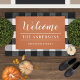 A porta personalizada Elegante e eterno apresenta "Bem-vindo" no script de caligrafia escrevendo com o sobrenome da sua família e o endereço de rua da sua casa personalizado em branco com sotaques simples de faixa. Nota, o fundo laranja/terracota queimado e as cores de texto branco podem ser modificadas para coordenar com a sua varanda ou decoração de entrada.