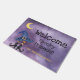 Esta bela porta do Dia das Bruxas apresenta gráficos aquarelas de pernas de bruxa e chapéu. O texto diz: Bem-vindos Amigos Loucos! Personalize a porta com seu nome.