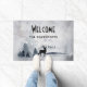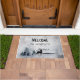 Porta-boas-vindas com uma imagem de aquarela com uma rena preta de silhueta, entre alguns pinheiros. Esquema de cor neutra a preto e branco.