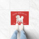 Uma porta de Natal adorável, com um Bichon Frise, vestindo um chapéu santa num fundo vermelho festivo.