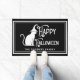 Welcome your guests in spooky style with this charming Halloween doormat featuring a black cat wearing a witch hat and the festive message "HAPPY HALLOWEEN." Perfect for adding a touch of fun and fright to your front porch or entryway! Make it uniquely yours by customizing it with your family name. A great way to greet trick-or-treaters and visitors with Halloween spirit!