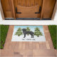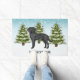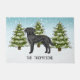 A ilustração original do desenho de Destei de um lindo cão negro da raça Labrador Retriever. O cão é colocado numa cena de inverno com três árvores de abeto verde e neve caindo. O fundo é um gradiente azul a branco que dá à design aquele olhar frio do dia de inverno. Há também uma área de texto personalizável para um nome.