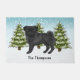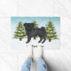A ilustração original do desenho de Destei de um adorável cão da raça Pug, casaco preto. O cão é colocado numa cena de inverno com três árvores de abeto verde e neve caindo. O fundo é um gradiente azul a branco que dá à design aquele olhar frio do dia de inverno. Há também uma área de texto personalizável para um nome.