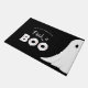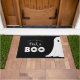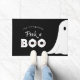 Um fantasma giro para fora da borda da porta. Texto "espiar um BOO" em fontes divertidas, escritas à mão e decorativas. Mostradas em cores de preto, branco e laranja, mas todas as cores são editáveis. Personalize o texto curvado com um nome de família, etc. © Kimbellish, LLC