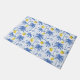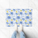 Blue Toile Palm Trees Lemons Doormat. Bring a splash of tropical coastal charm to your home decor with this design featuring a light blue striped background adorned with sketched blue palm trees and vibrant yellow lemons. Add sophisticated elegance to your living space with this unique, original design.