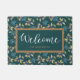 Esta esteira bem-vinda floral colorida caracteriza flores pintadas aguarela com luz - as flores todas azuis e do roxo em um fundo escuro da cerceta. A palavra "boa vinda" aparece uma mão branca na moda escrita o texto do estilo. O texto feito sob encomenda permite que você adicione seu nome.
