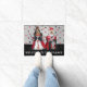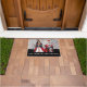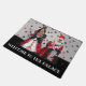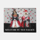 Esta esteira de porta caracteriza os retrievers dourados vestidos como o rei e a rainha dos corações. O texto lê, "dê boas-vindas ao palácio".