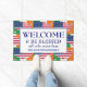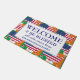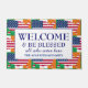Casa IRLANDESA AMERICANA de boas-vindas com texto PERSONALIZÁVEL. Na moda, patriota WELCOME Doormat com a menção WELCOME & BE BLESSED ALL OMS ENTER AQUI mais placeholder name (BEM-VINDO e BEM-VINDO BEM-VINDO). O fundo é a bandeira da IRLANDA, com o esboço do mapa da bandeira dos ESTADOS UNIDOS num padrão de toda a escala. Todo o texto é PERSONALIZÁVEL para que você possa alterar o texto de acordo com suas necessidades, por exemplo, adicionar nome da família, lema da família, citação inspiradora.