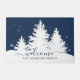 Porta de inverno com pinheiros brancos com neve contra fundo azul marinho. Manuscrito bem-vindo e nome da família.