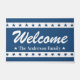 Esta porta azul e branca apresenta uma borda de estrelas patrióticas no topo e no fundo com 'Bem-vindo' em uma grande escrita decorativa branca. Personalize adicionando seu nome, nome de família ou texto especial. Perfeito para a época de verão e feriado no dia 4 de julho.