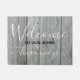 A porta da casa de fazendeiros se reúne para receber convidados em estilo. O fundo da madeira rústica adiciona um olhar de canto. Personalize com o nome da família.