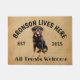 O Rottweiler Personalizado Adorador de Cachorros bem-vindo. Este tapete de boas-vindas pode ser personalizado com o nome do seu cão, o slogan também pode ser mudado ou você pode usar uma fotografia do seu próprio cão (certifique-se de que é transparente). O texto diz: Bronson mora aqui... Todos os tratamentos são bem-vindos Edite o design para alterar a fonte, as cores e a cor de fundo. Faz um presente maravilhoso para uma festa de inauguração, feriados, amantes de cachorros e a maioria das vezes.