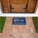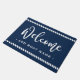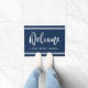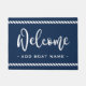 Boas-vindas a cores azuis ou personalizadas a bordo do tapete de porta com o texto "bem-vindo" em uma letra elegante de script de caligrafia com o nome de barco personalizado abaixo e bordas brancas de corda acima e abaixo.