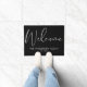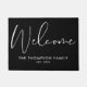 Uma elegante esteira de porta preta e branca com bela caligrafia de boas-vindas e personalizada com o nome da sua família e data especial. Desenhada por Thisisnotme©