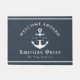 A design do barco "Bem-vindo a Bordo" náutico apresenta uma estética litorânea azul e branca, marinho na moda, realçada com uma âncora de barco. Personalize-o com o nome, a localidade, o estado e a data estabelecida do seu barco para um toque único. Este tapete personalizado faz um presente fantástico para os proprietários de barcos, perfeito para acolher convidados a bordo.