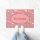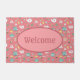 Bonito tapete de boas-vindas, cor-de-rosa, pintado com um padrão de chá de chaleiras, bules, colheres e cubos de açúcar. Perfeito para compradas de chá, cafés e passagens de jardim