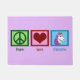 O presente dos Unicórnios do Peace Love com um sinal de paz, coração, e um belo unicórnio com um homem roxo.