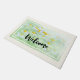 Bem-vinda à porta com uma fotografia fresca e de Verão que inclui uma coleção de margaridas selvagens com grandes centros amarelos a crescer num campo verde.